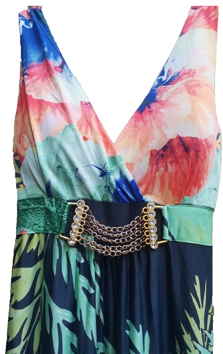 Bred linning under brystet som er pyntet gult/gylden metal med rhinsten pynt og hængende gyldne kæder imellem.