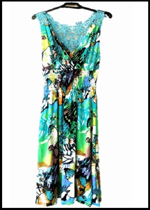 Lækker sommerkjole i turkis mix med farverigt mønster og sommerfugle.