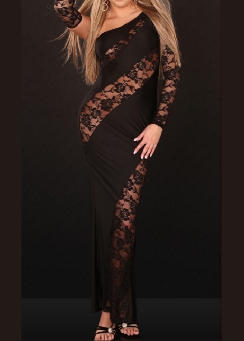 Sexet lang kjole i sort med gennemsigtigt blonde design i fronten.